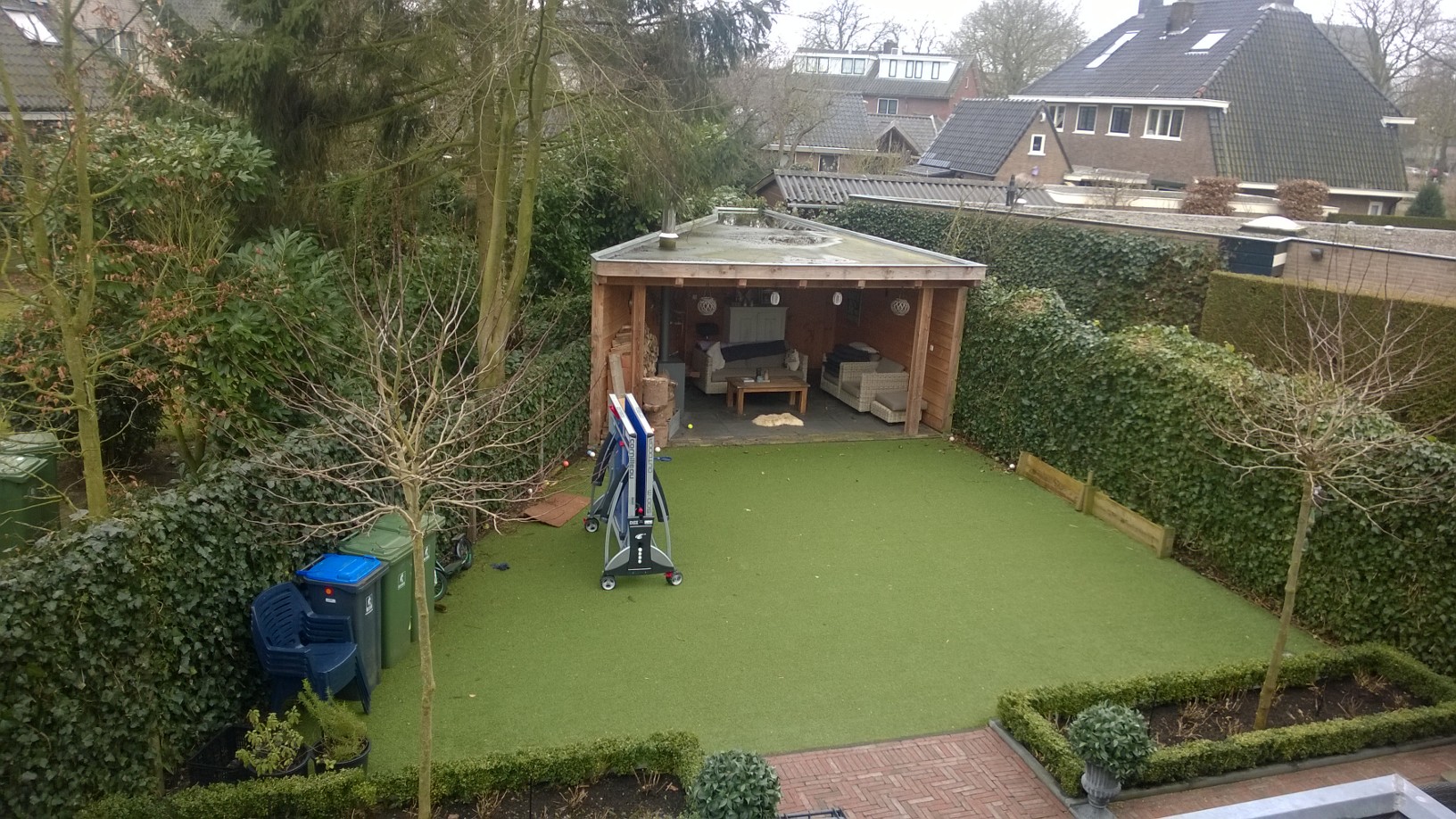 Een leuke douglas overkapping op maat , aangepast aan de ruimte in de tuin. Achter deze douglas overkapping op maat is een klein schuurtje gemaakt voor opslag van kussens , aangekleed met een lounge bank en een houtkachel erin voor de wat koelere avonden .