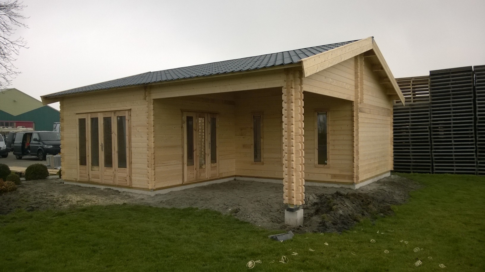 Zeer ruime Garage Miami 750x800cm, geleverd met een electrisch bedienbaren sectionaaldeur GD03 (incl. 2 afstandsbedieningen en een lamp op de motor), een vouwdeur DL01H, een vouwdeur VL02H een dichte paneeldeur DD03 en 3 vaste ramen PJ07. De Garage Miami wordt geleverd met een inpandige luifel van 400x350cm. Geleverd inclusief tussenwand (zie plattegrond)